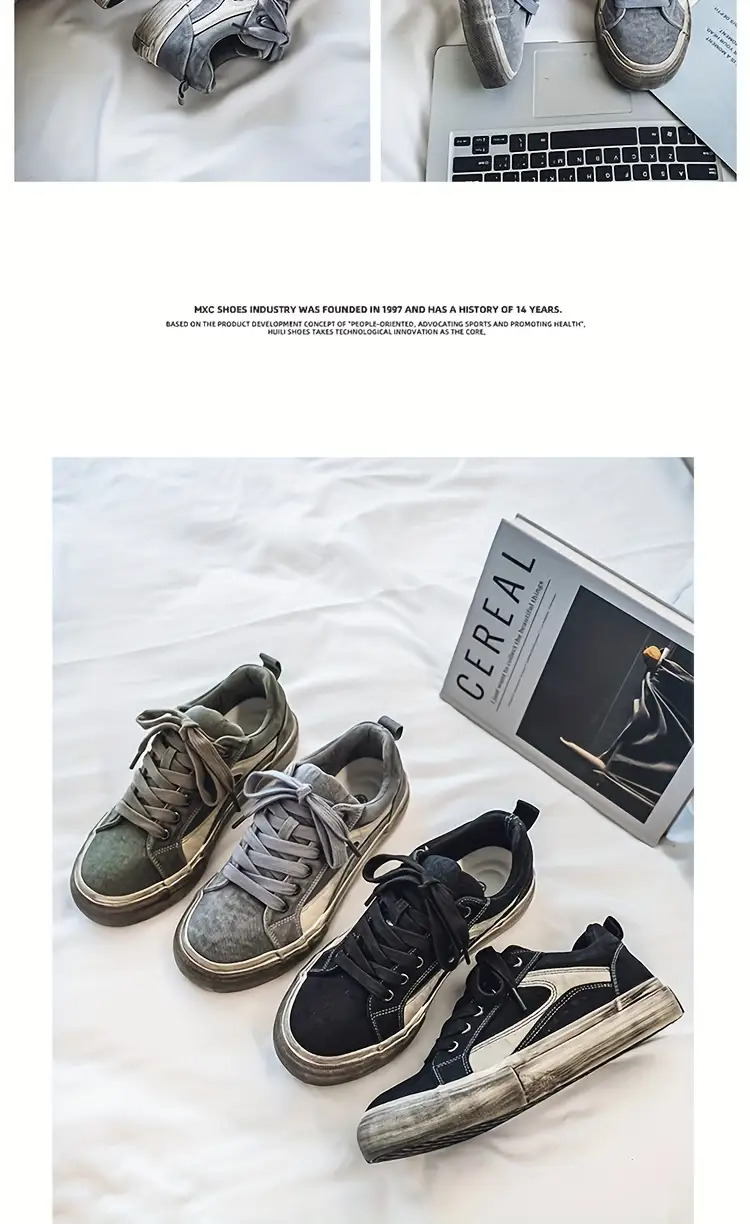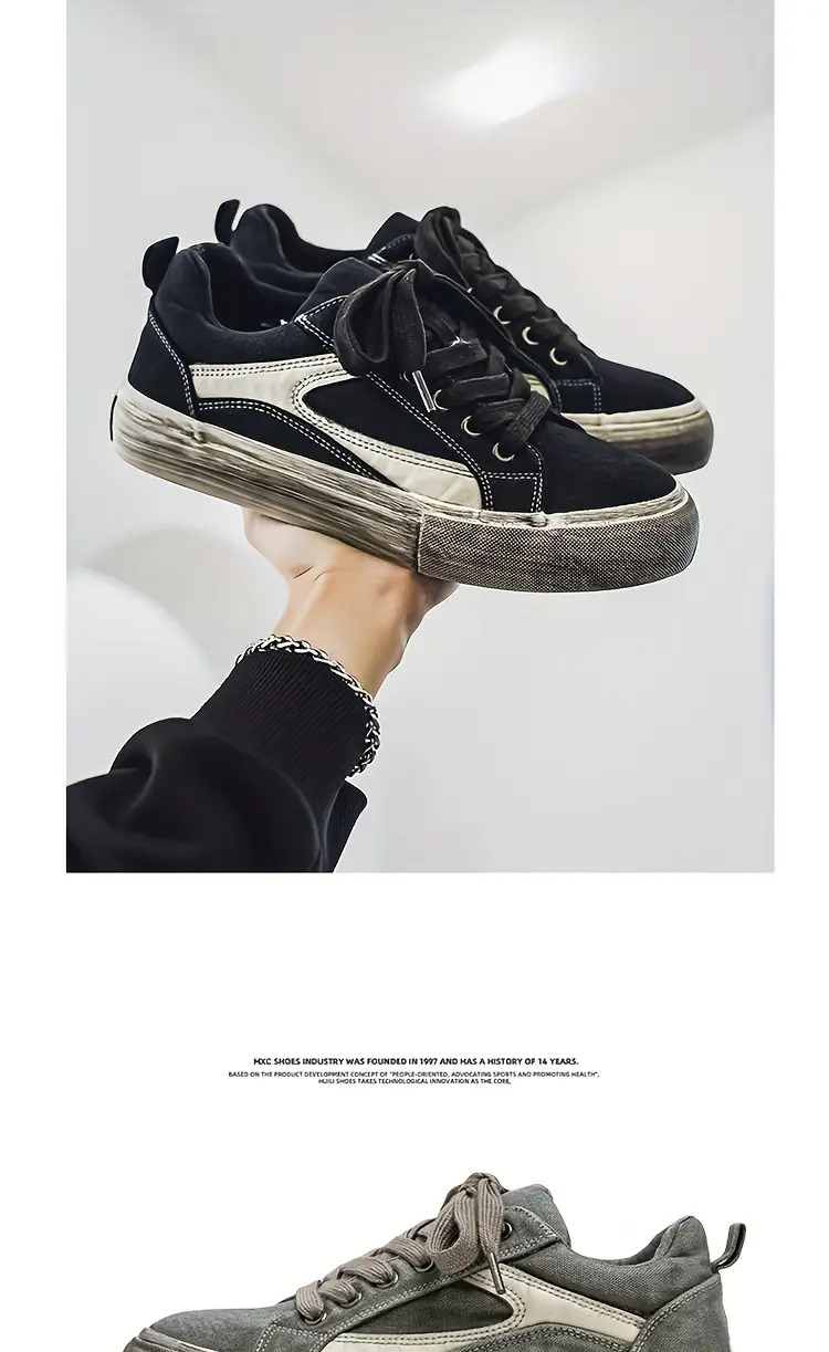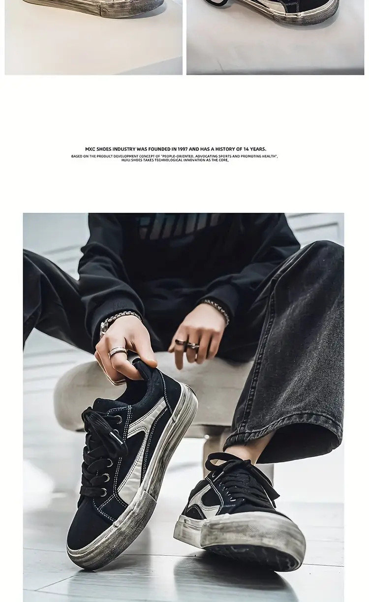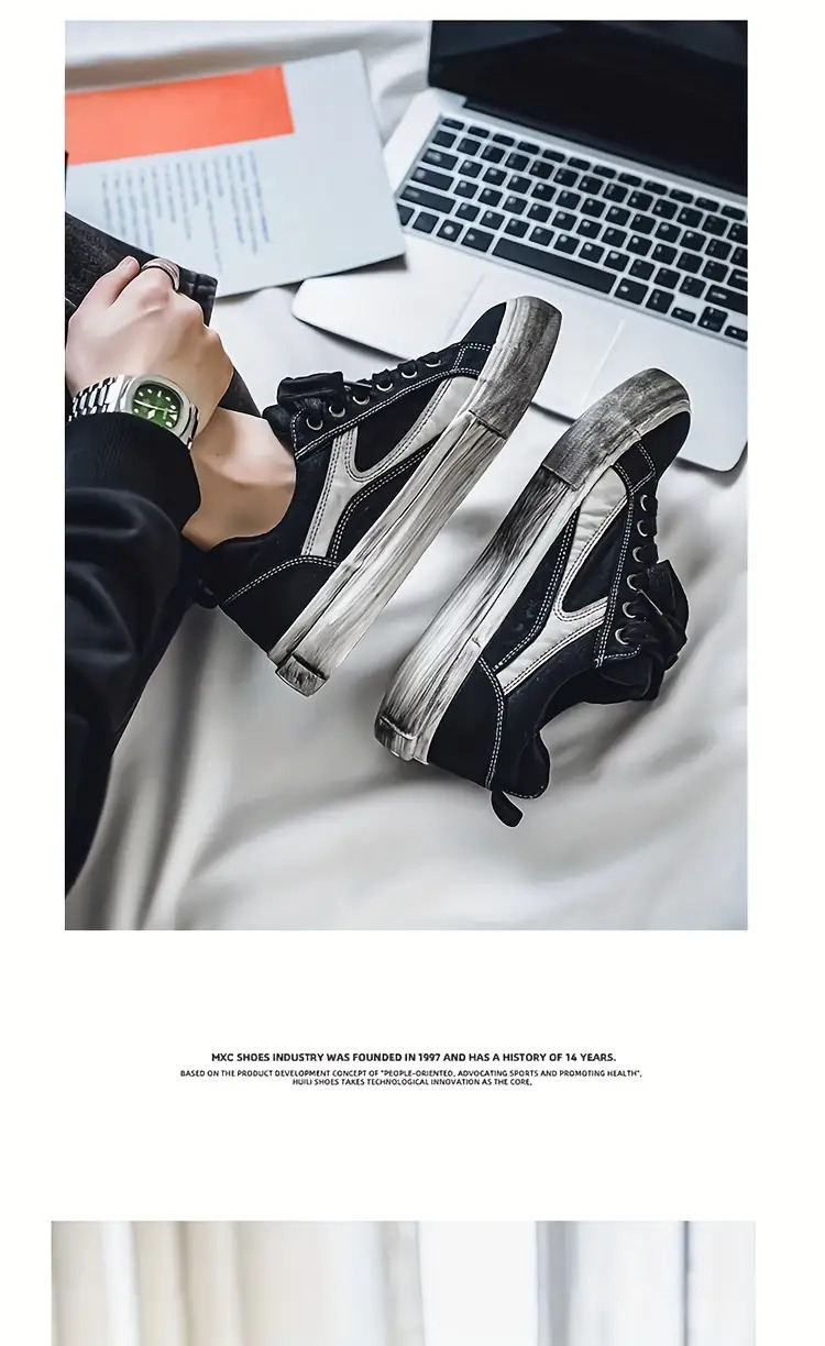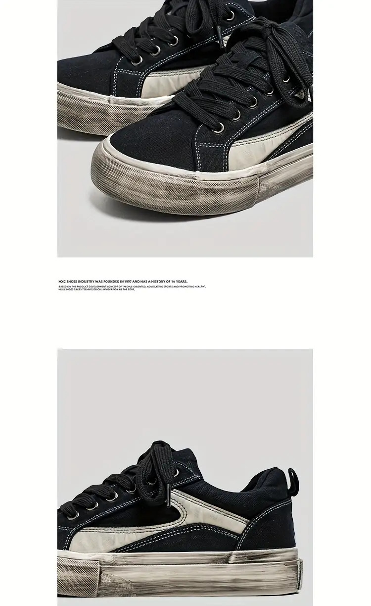 Men's Vintage Distressed Black & White Low-Top Canvas Sneakers - Retro Streetwear Lace-Up Shoes with Durable Rubber Sole & Cushioning, Round Toe Casual Wear Suitable for - (Aged Black/White)