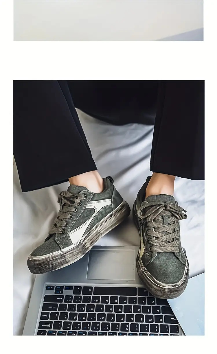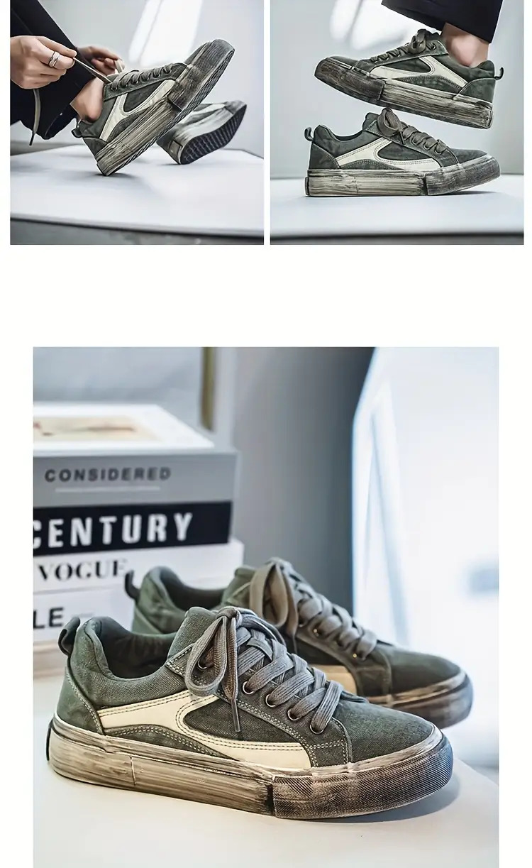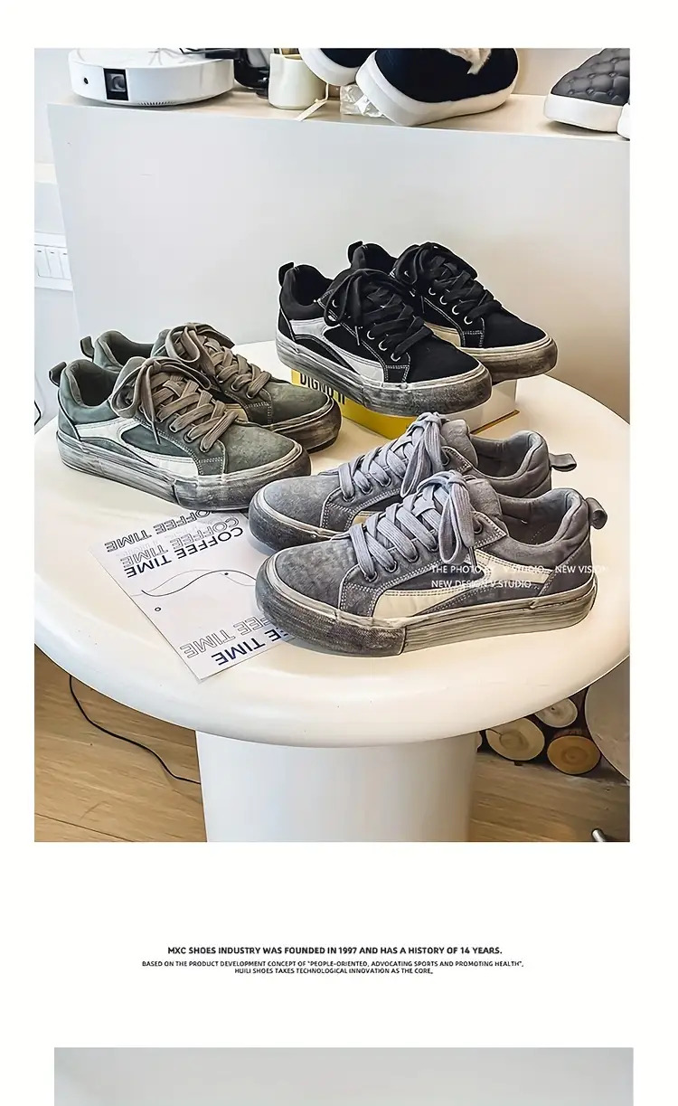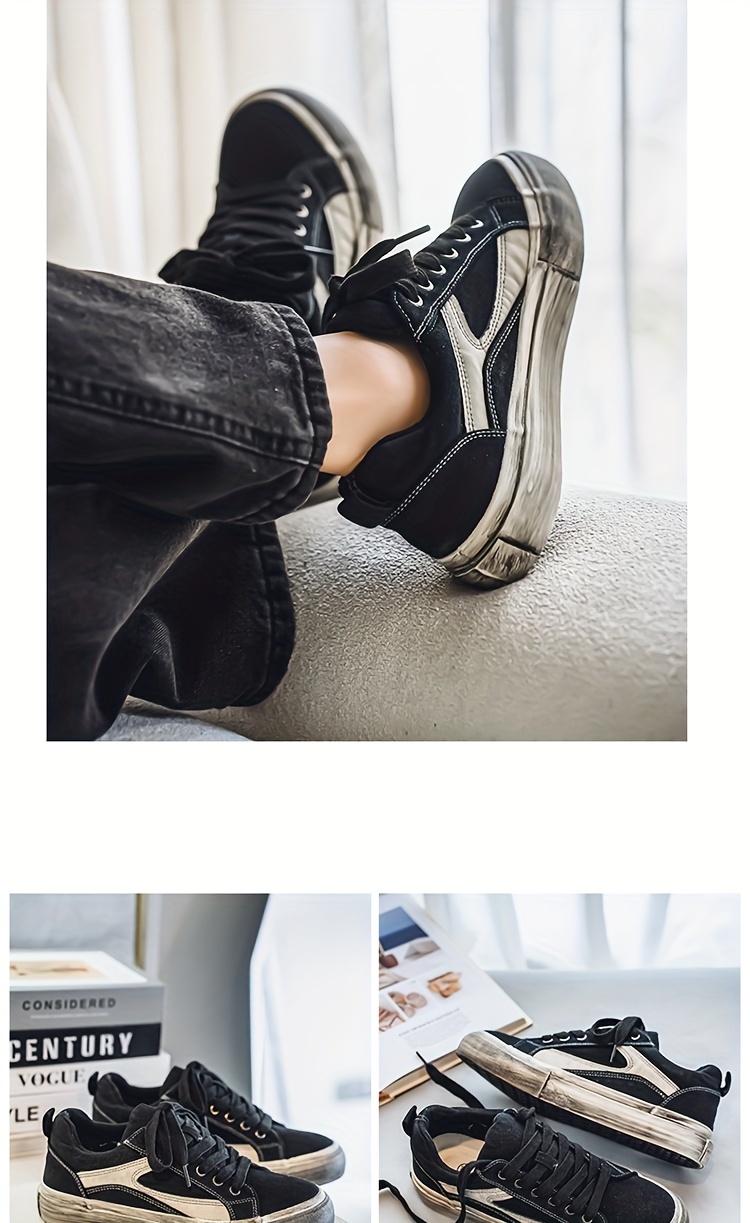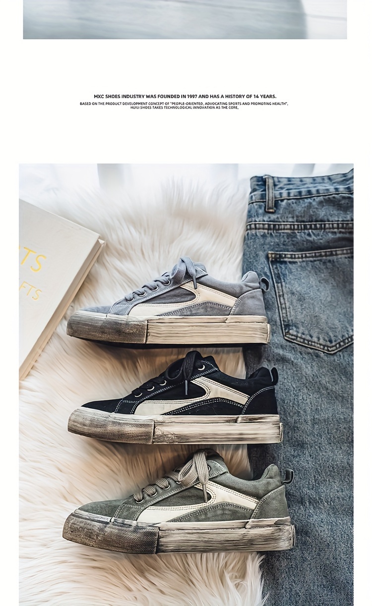 Men's Vintage Distressed Black & White Low-Top Canvas Sneakers - Retro Streetwear Lace-Up Shoes with Durable Rubber Sole & Cushioning, Round Toe Casual Wear Suitable for - (Aged Black/White)